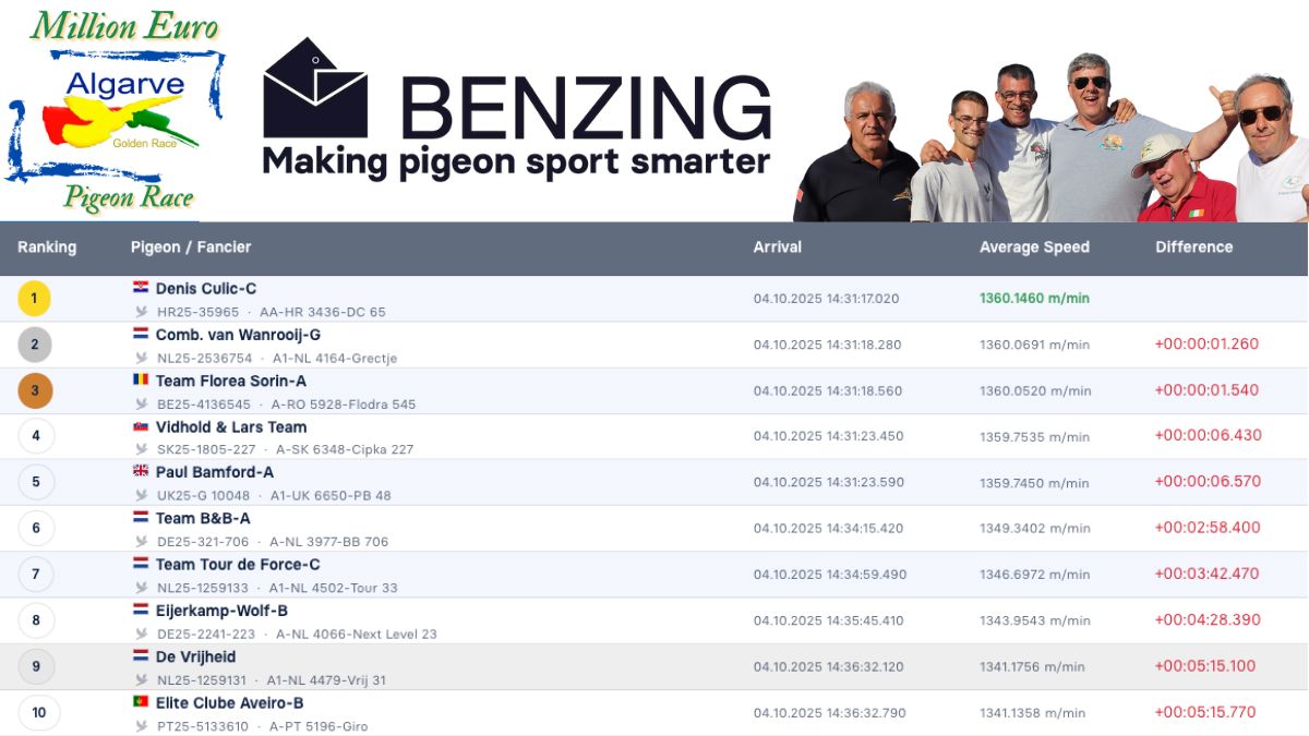 The sun had just climbed above the hills of Bragança when the final release of the Algarve Golden Race 2025 took place. At 8:20 a.m. Portuguese time, thousands of Racing Pigeons took to the air for the ultimate test — 505 kilometers of endurance, instinct, and heart. And when the clock struck 14:31:17, one name stood above all: Denis Culic from Croatia. His pigeon HR25-35965 “DC 65” stormed home with an average speed of 1360.146 m/min, narrowly beating giants like Comb. van Wanrooij and Team Florea Sorin. A finish decided by tenths of a second — like a Formula 1 photo finish, but this time with feathers instead of wheels.