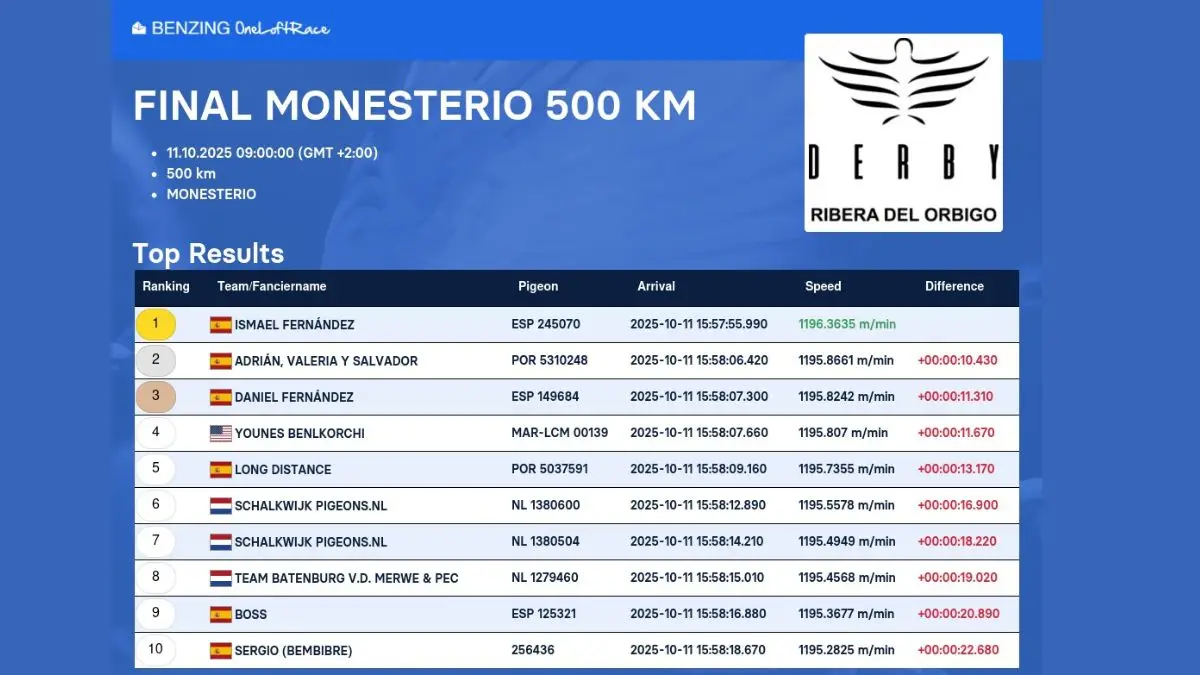 The Final Monesterio 500 km of Derby Ribera del Orbigo 2025 took off on October 11 at 09:00 AM from Monesterio. A classic 500-kilometer challenge under perfect racing conditions — clear skies, a light headwind, and fierce competition from across Europe. With fanciers from Spain, Portugal, the Netherlands, Morocco and more… the race quickly turned into a high-speed battle decided by mere seconds. The winner, Ismael Fernández (ESP 245070), clocked at 1196.36 m/min, just ahead of Adrián, Valeria y Salvador and Daniel Fernández.