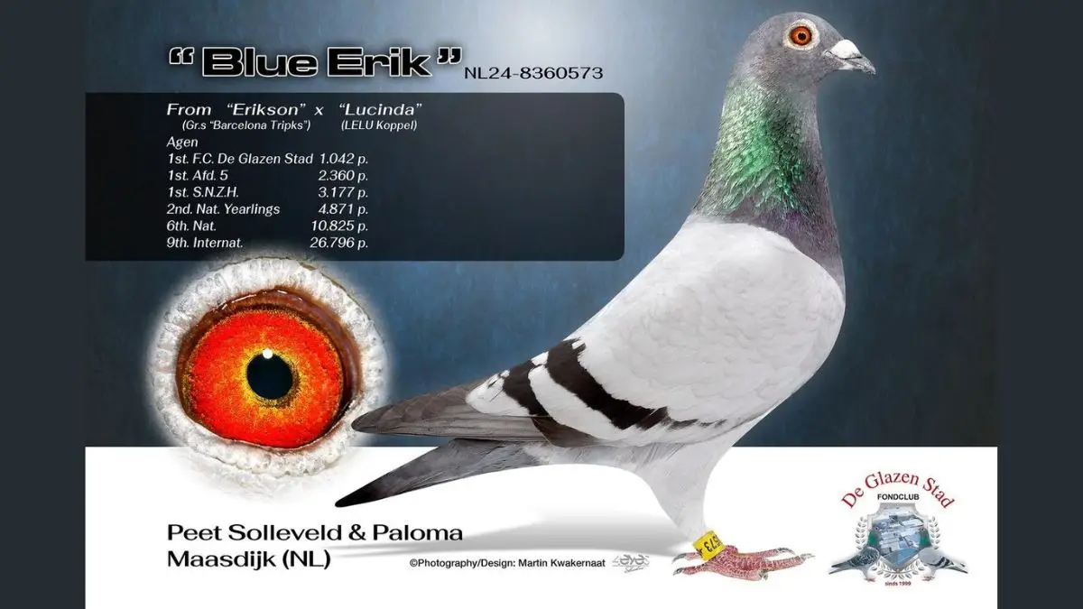 “Blue Erik” is a direct son of “Erikson” (NL19-1603041), himself a son of RSC Erik (Erik Limbourg) and Nestzus Pouli Barca (De Smeyter-Restiaen) — two of the most powerful names in modern marathon racing. “RSC Erik” is sire to multiple National top performers including 2nd Nat. Agen 2023 and 2nd Nat. Agen 2025, while the dam’s side descends directly from the world-famous Barca family known for their endless stamina and fighting spirit.